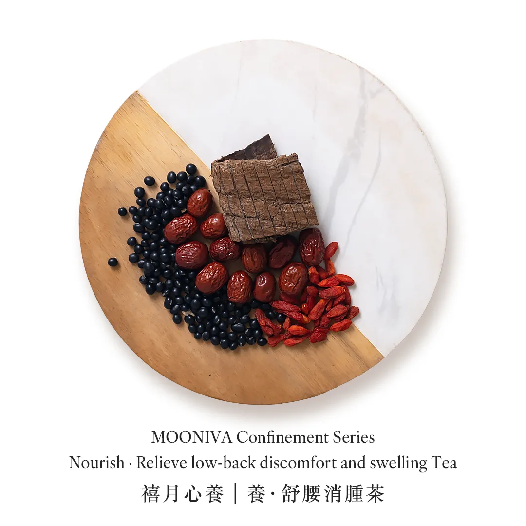Relieve low-back discomfort and swelling Tea x 3 Benefits | Nourishes the liver and kidneys, activates blood, relieves soreness in the lower back and knees, reduces swelling, and accelerates postpartum recovery. Ingredients | Black Soybean, Eucommia Bark, Wolfberry, Red Dates