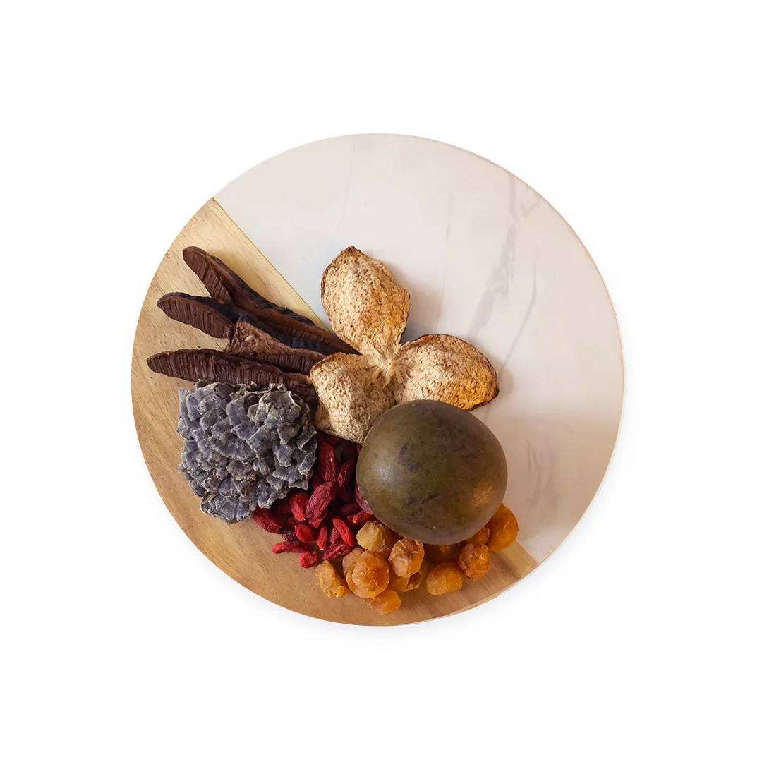 Reishi Mushroom、Trametes versicolor、Dried Tangerine Peel、Longan、Wolfberry、Monk Fruit