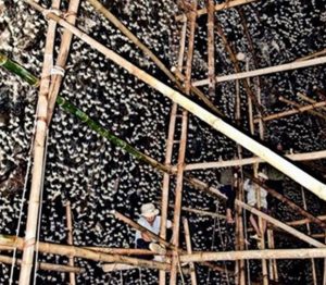 待燕子生產過後,採燕人需要通過搭建竹架,繩索等方式,攀上數十米乃至上百米高的峭壁,用人手一個一個把燕窩摘取下來。